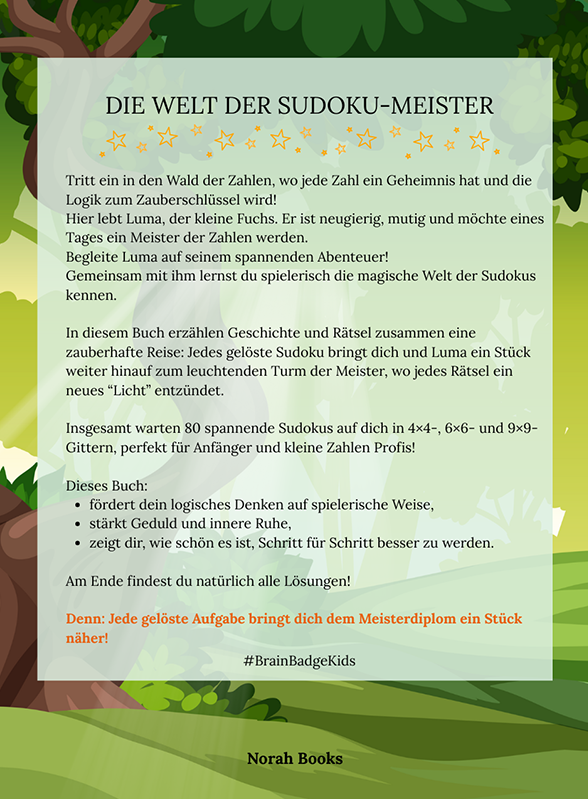 - Im ersten Band begleitet Luma, der kleine Fuchs, die 8–12-Jährigen auf ihren ersten Sudoku-Abenteuern – voller Erfolgserlebnisse, ausmalbarer Illustrationen und sammelbarer Abzeichen.